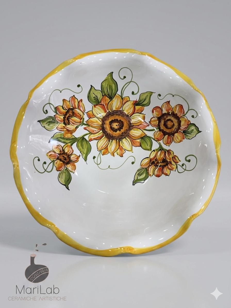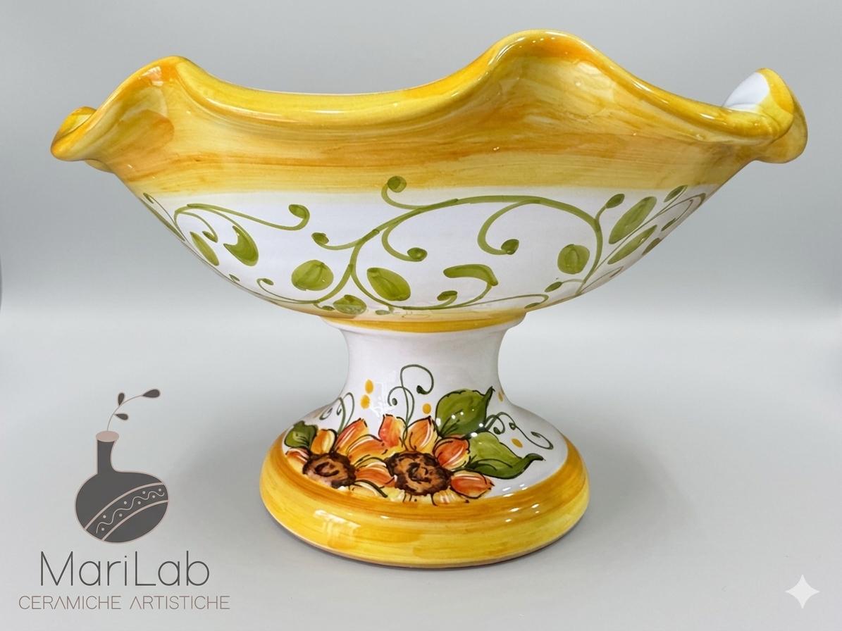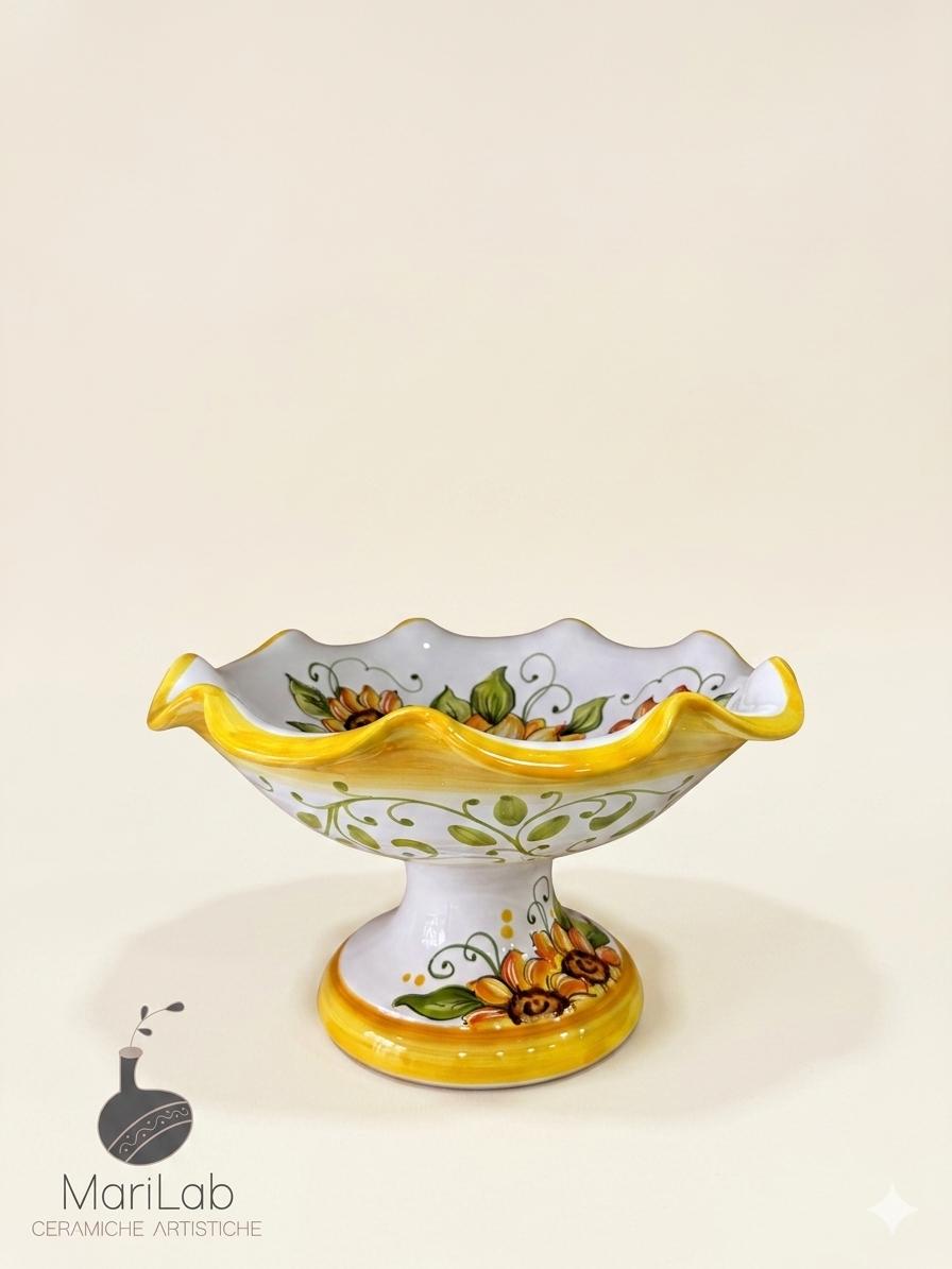 Alzatina smerlata diametro 25, altezza 15 cm. Decoro girasole.