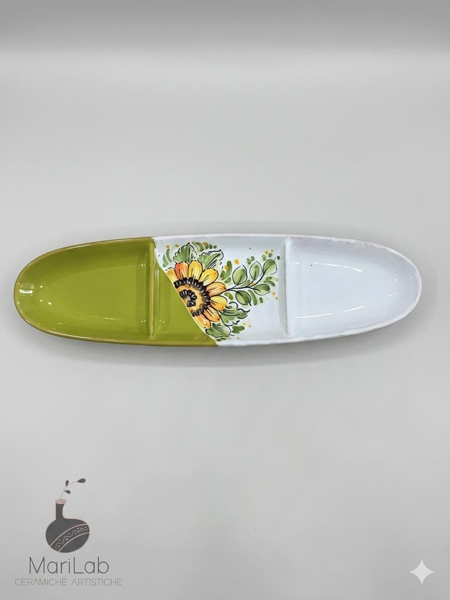 Ideale per aperitivo, questa antipastiera ovale è stata dipinta e realizzata interamente a mano, ogni imperfezione è segno di unicità del prodotto artigianale.