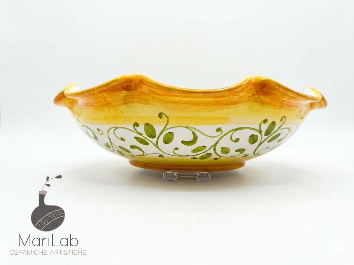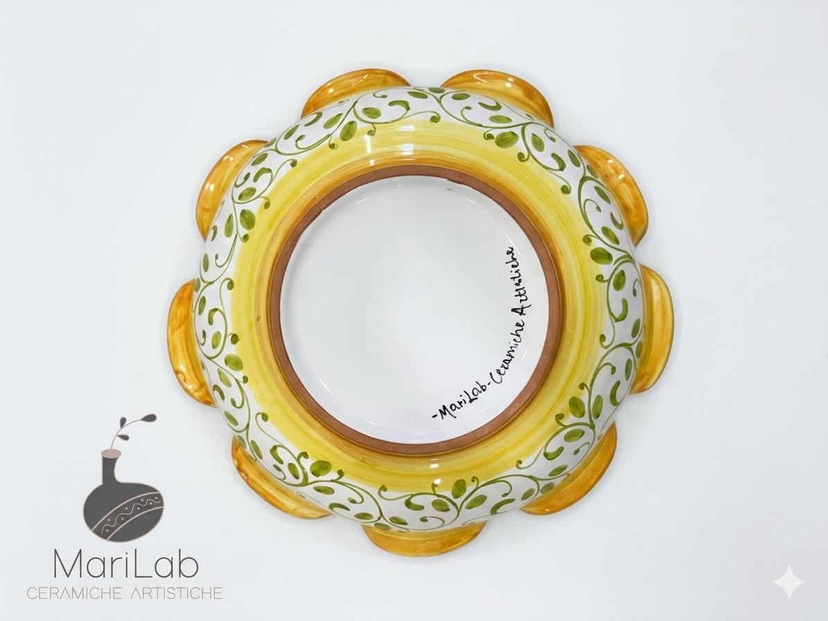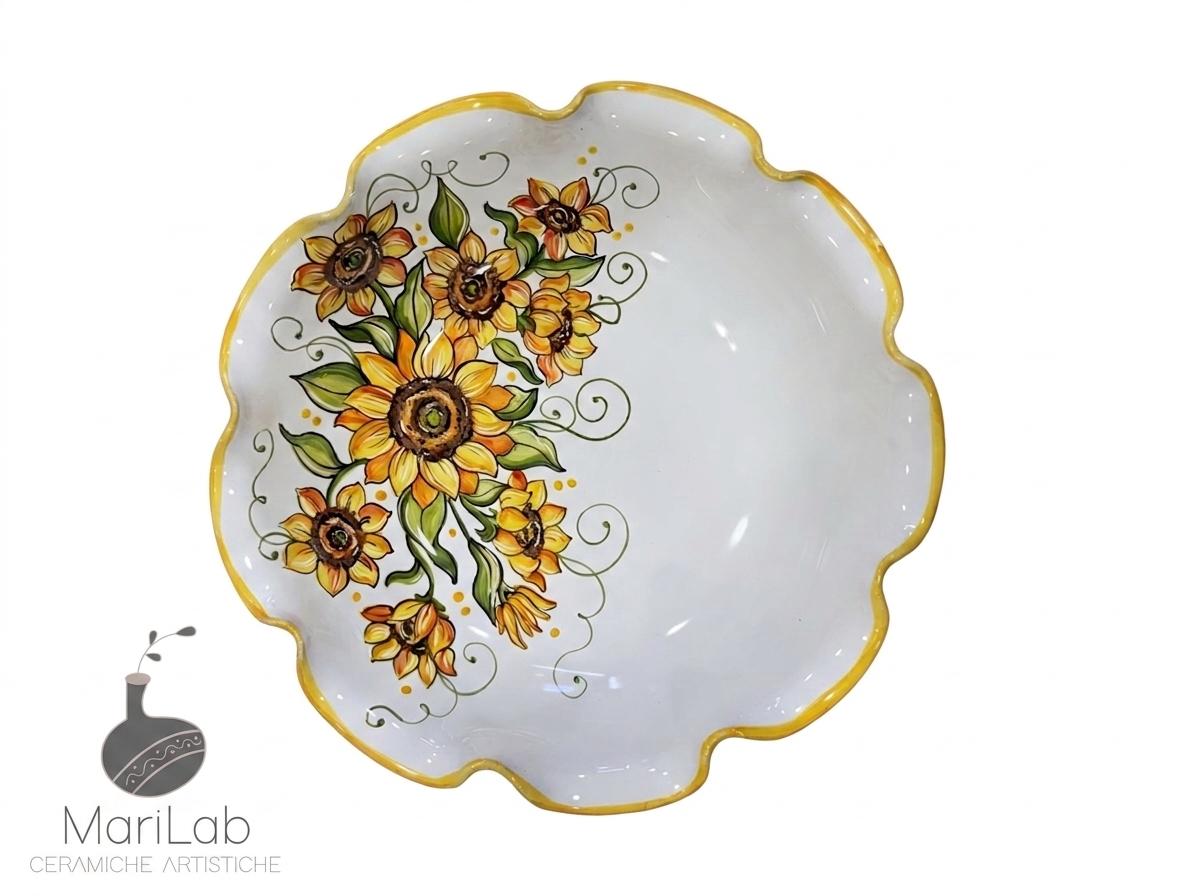 Centrotavola smerlato tondo, ideale come portafrutta. Decoro Girasoli, interamente dipinto e realizzato a mano, ogni imperfezione è segno di unicità del prodotto artigianale.