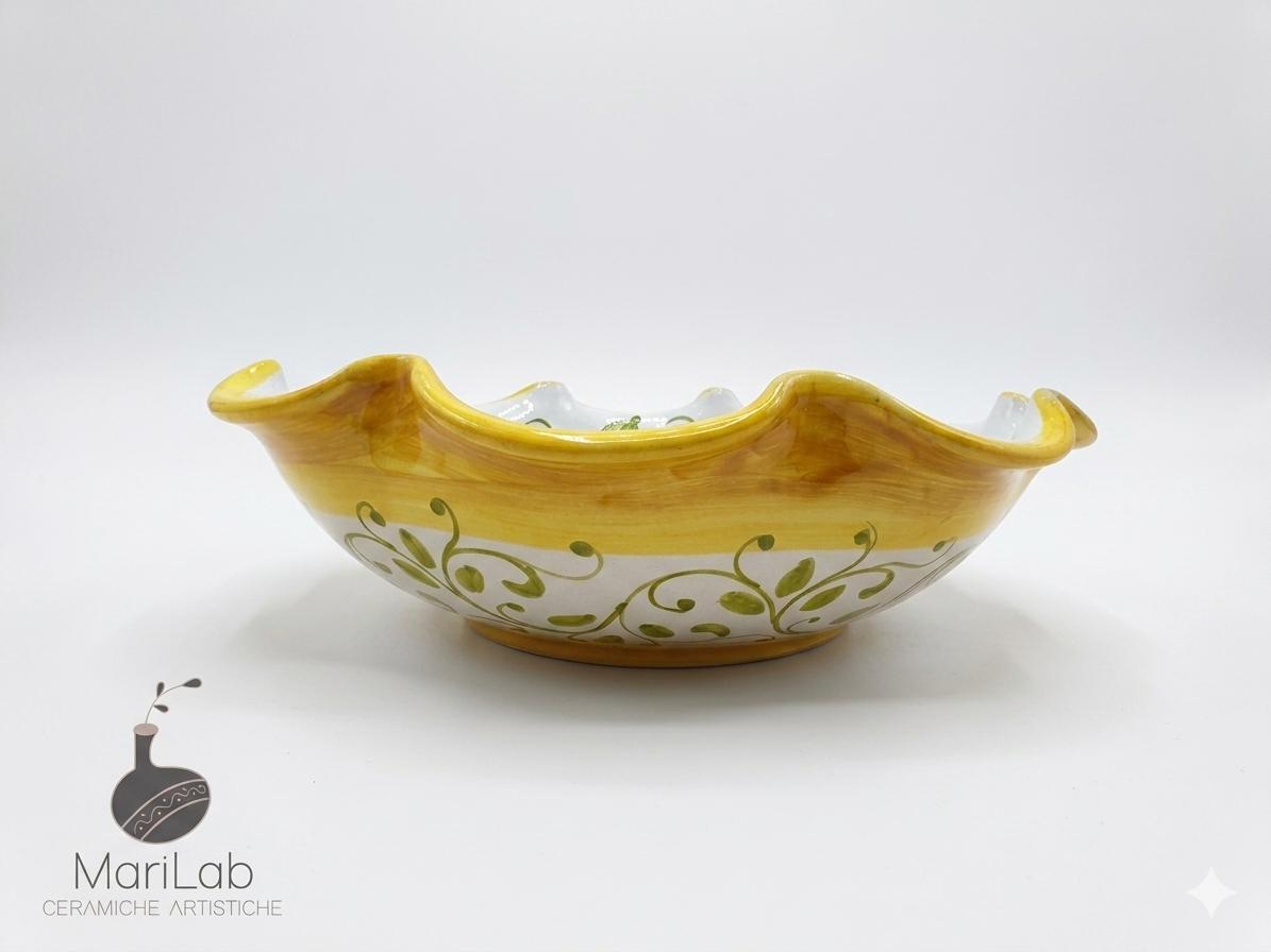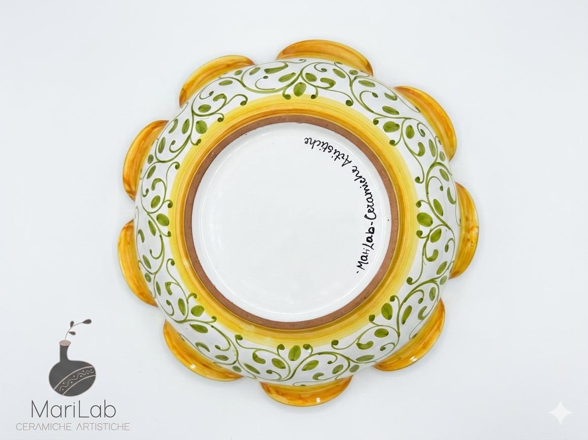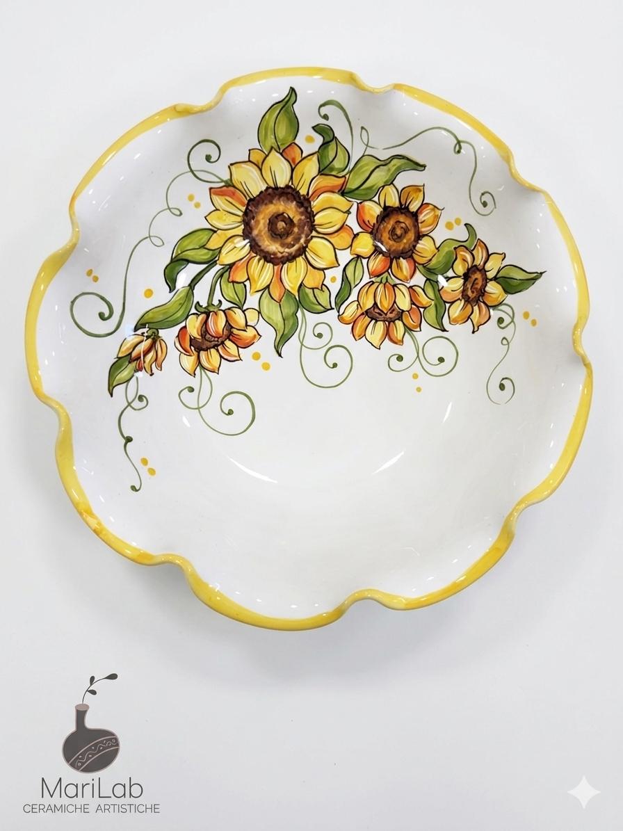 Centrotavola tondo smerlato, ideale per portafrutta, Decoro Girasoli. Dipinto e realizzato interamente a mano, ogni imperfezione è segno di unicità del prodotto artigianale.