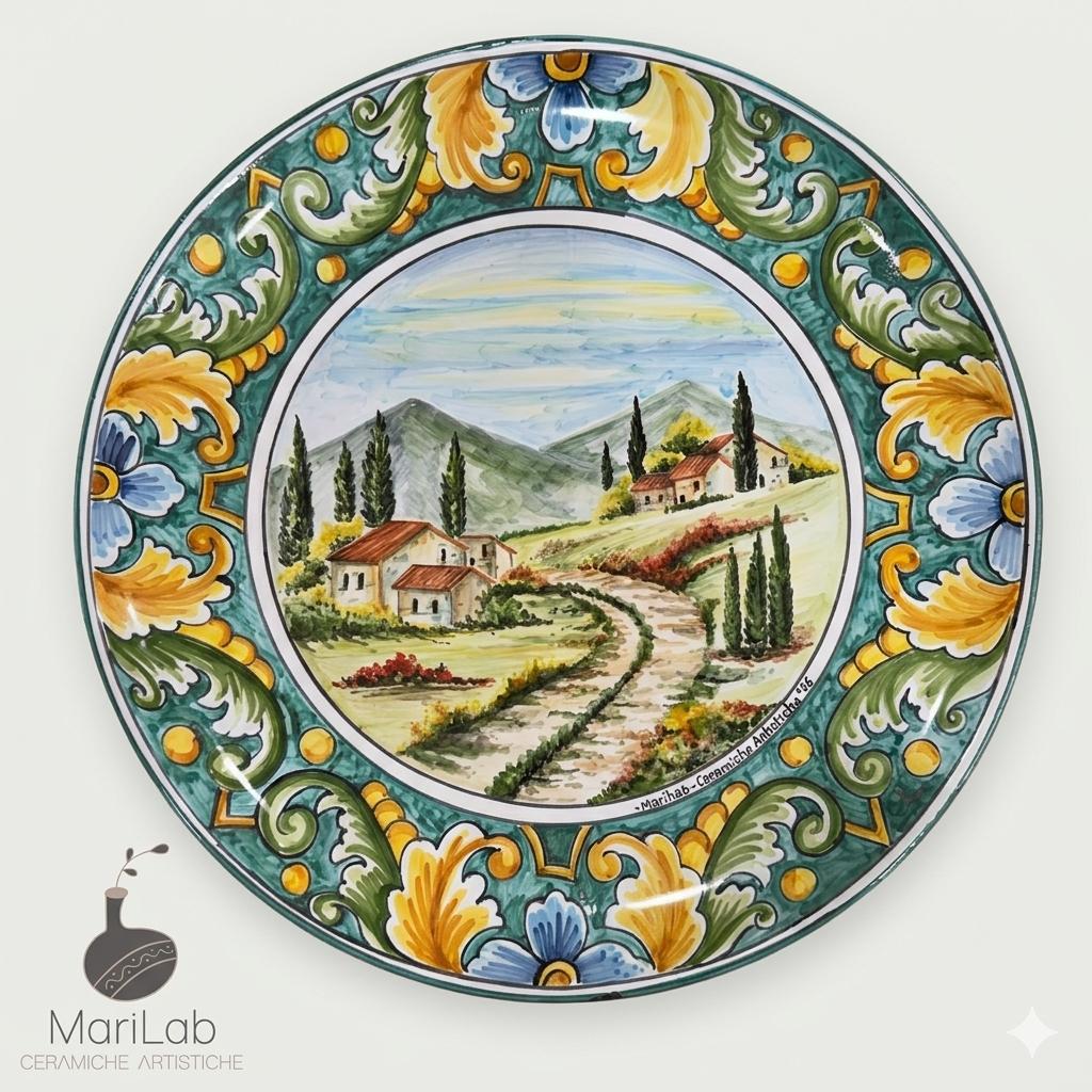 Piatto da muro 35 cm. di diametro decorato interamente a mano con un paesaggio di ambientazione toscana. Ogni imperfezione e segno di unicità del prodotto