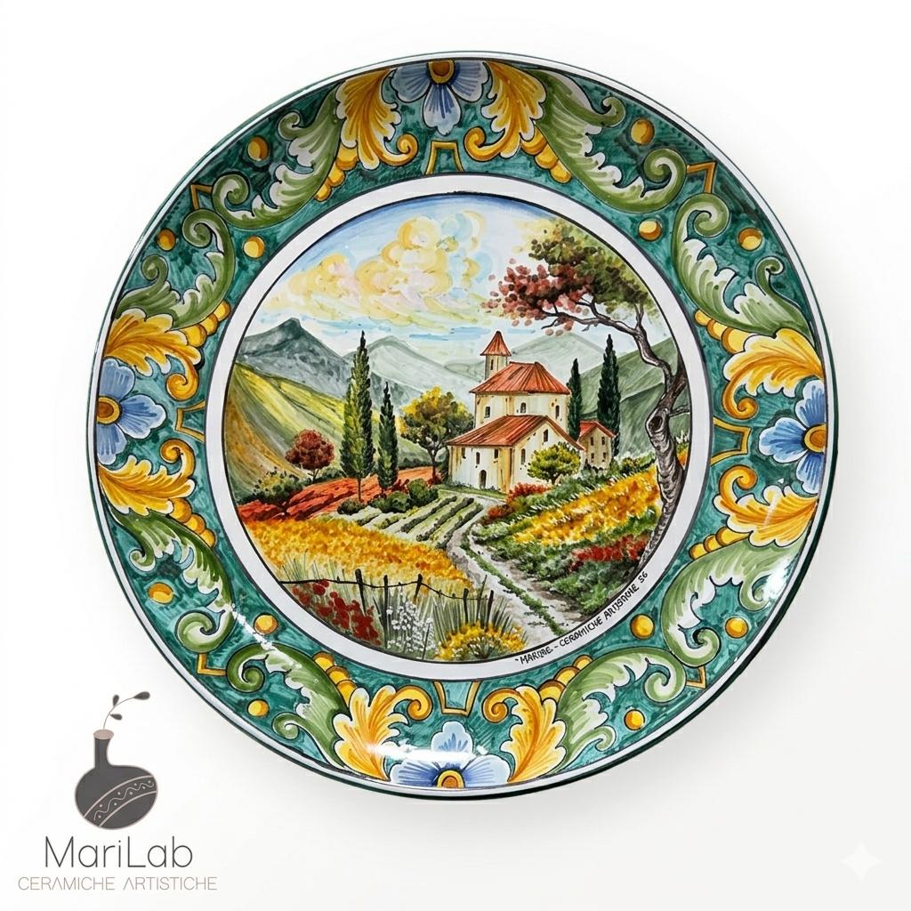 Piatto da muro 40 cm. di diametro decorato interamente a mano con un paesaggio di ambientazione toscana. Ogni imperfezione e segno di unicità del prodotto.