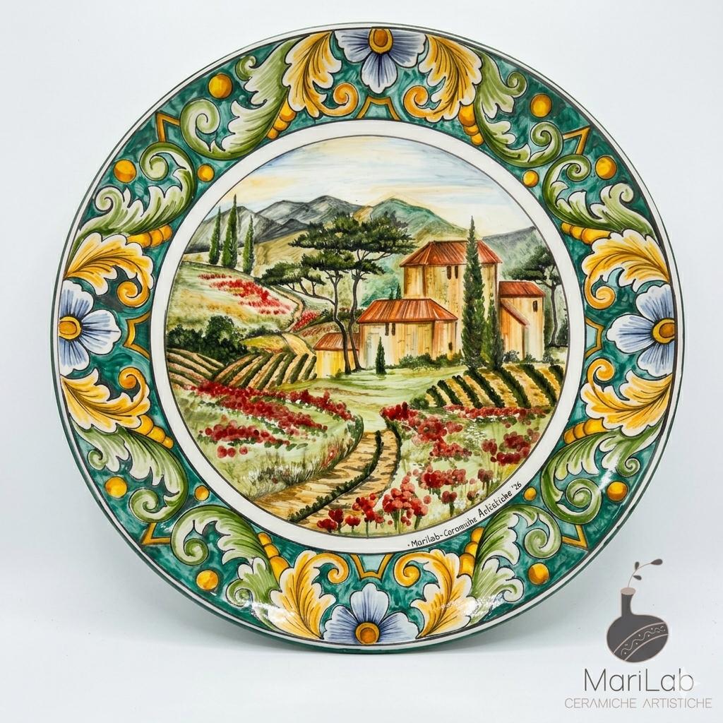 Piatto da muro 40 cm. di diametro decorato interamente a mano con un paesaggio di ambientazione toscana. Ogni imperfezione e segno di unicità del prodotto