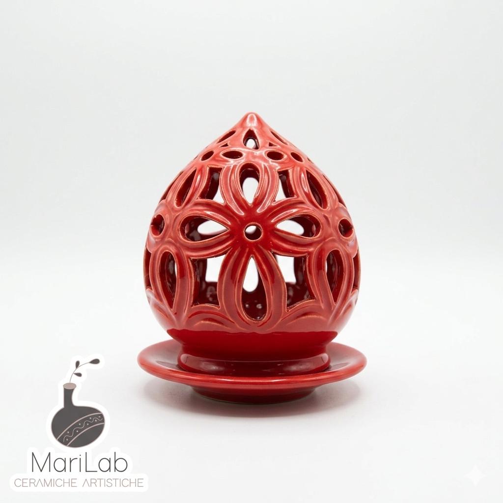 Porta candela traforato 16 cm altezza, con piattino per la candelina light, smaltato rosso